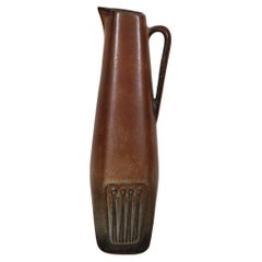 Il vaso in vetro artistico vintage ha una forma a brocca con manico scultoreo in vetro trasparente applicato e un corpo multicolore complesso; strati di vetro grigio scuro, marrone m...
