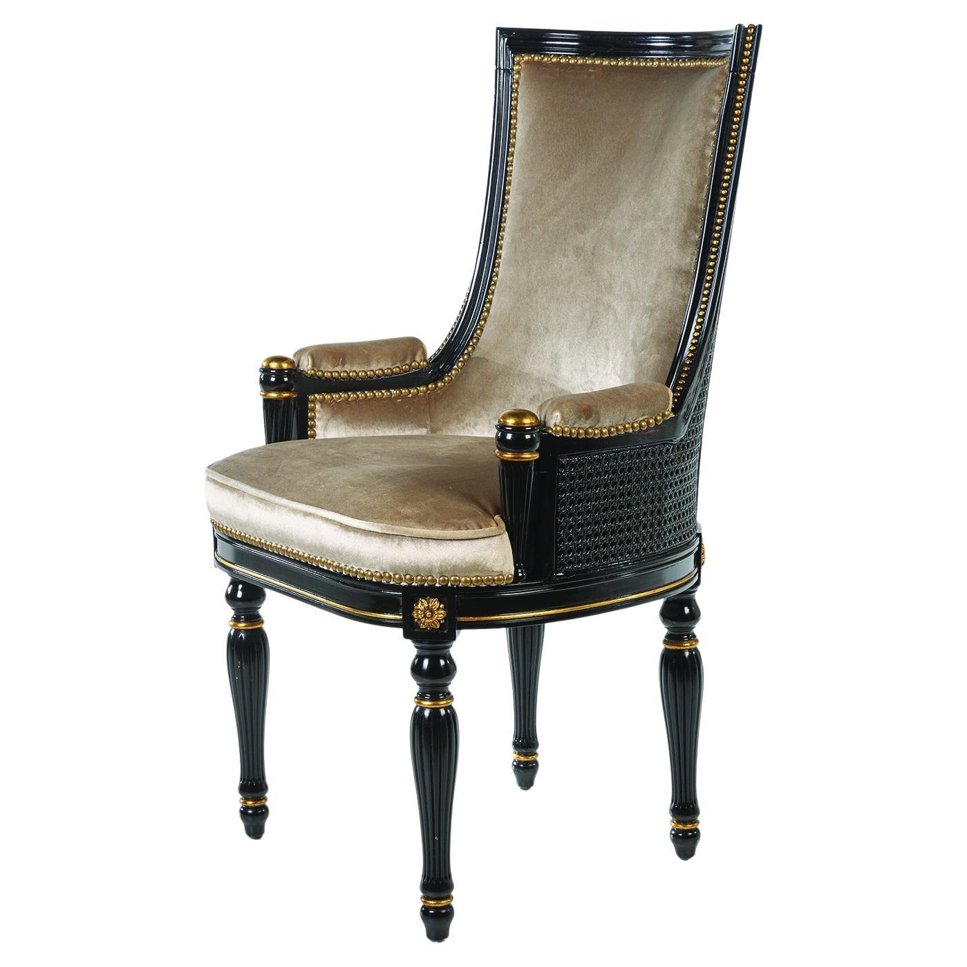 Struttura in legno massiccio con finitura laccata. Schienale in canna indiana annodata. Rivestimento in tessuto o pelle. Decorazione con dettagli in bronzo.