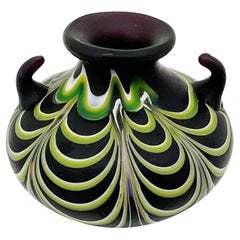 Lampada da tavolo antica in stile Aesthetic Movement / Art Nouveau di epoca vittoriana. Lampada a forma di fungo realizzata in vetro scoria blu, bianco e viola incorniciato da disegn...