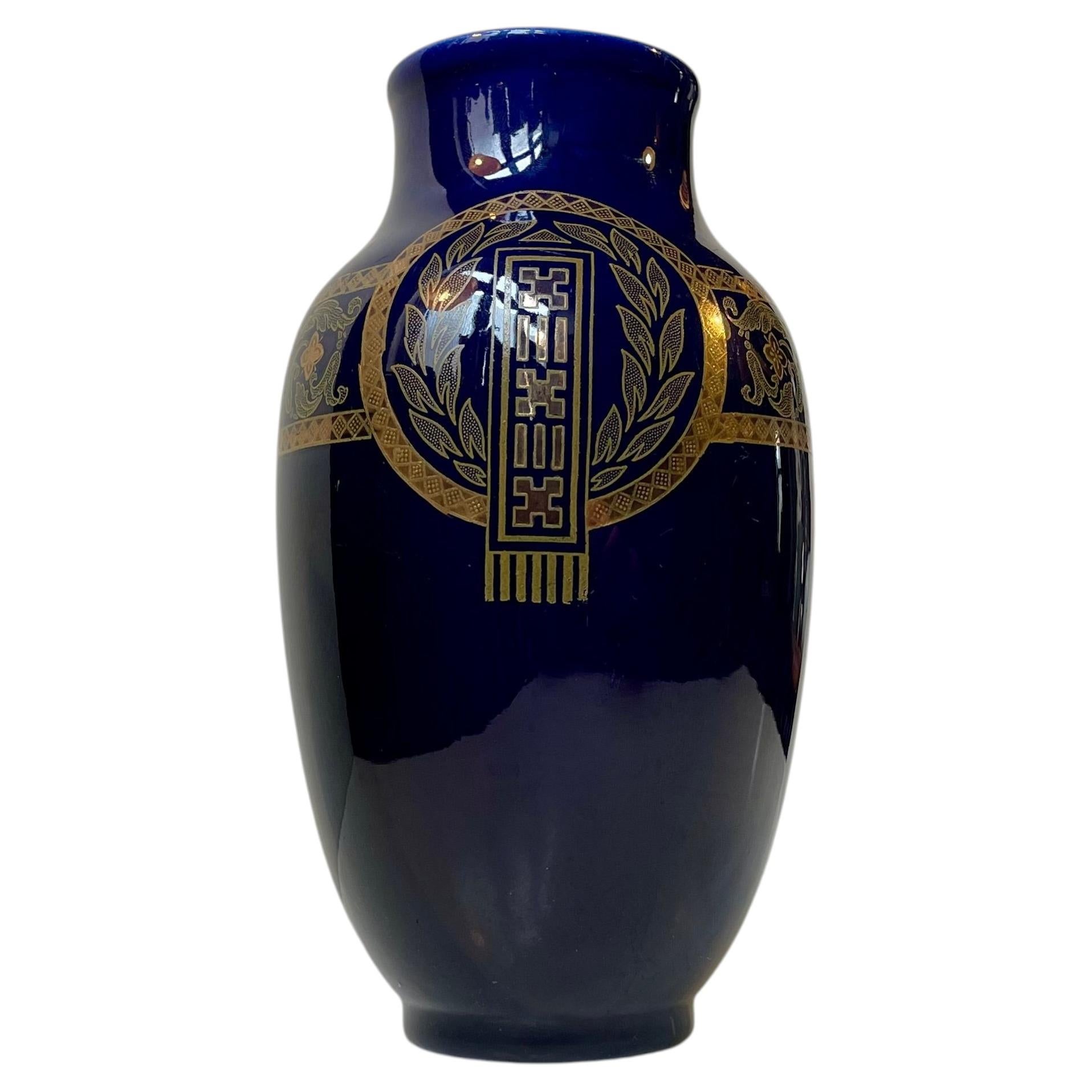 Vaso neoclassico francese in maiolica blu cobalto di Sarreguemines, anni '20
