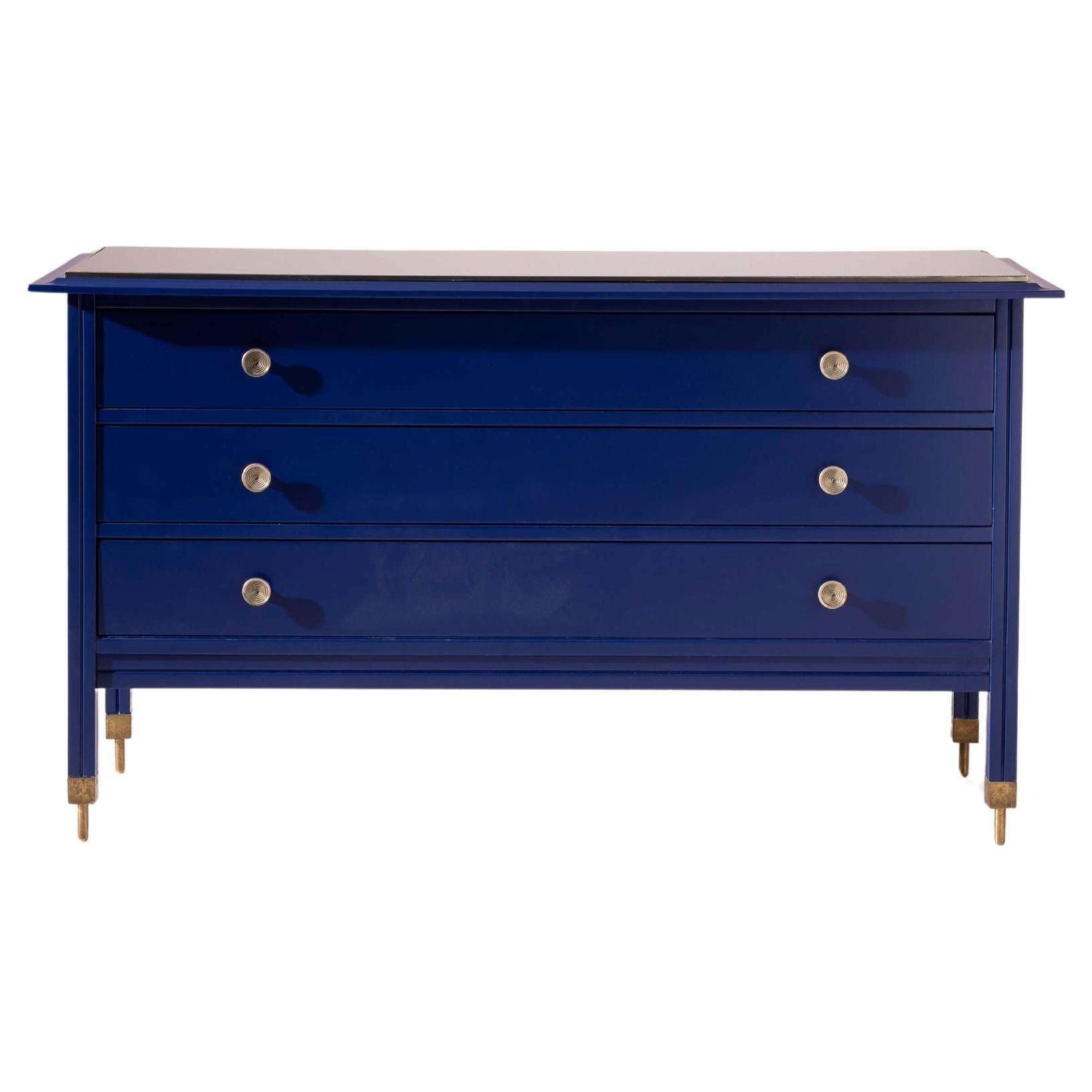 Questa cassettiera di Carlo De Carli per Sormani trasmette una tranquilla sensazione di sicurezza. La laccatura blu profondo ha un tono calmo e vellutato, mentre il piano in vetro sp...