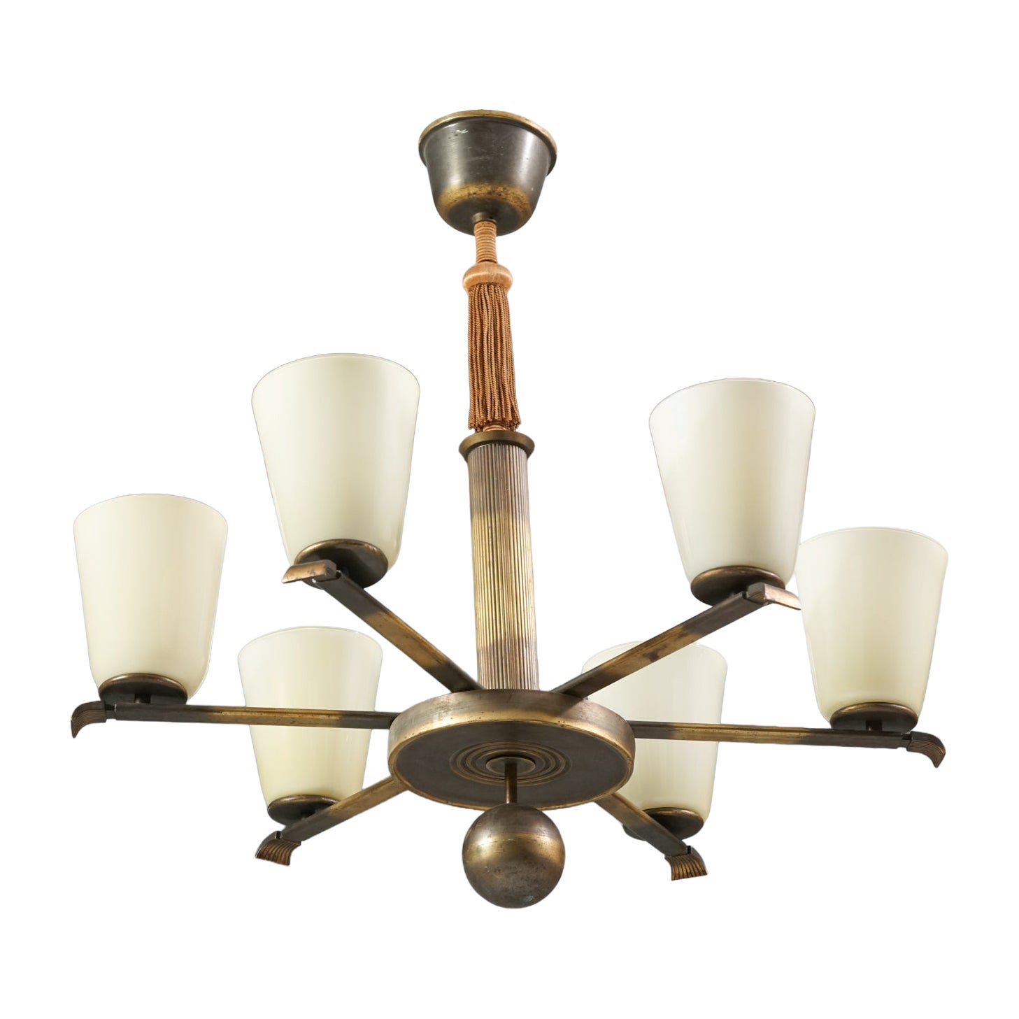 Monumentale lampadario in ottone e vetro opalino Paavo Tynell Art Deco, Taito 1930