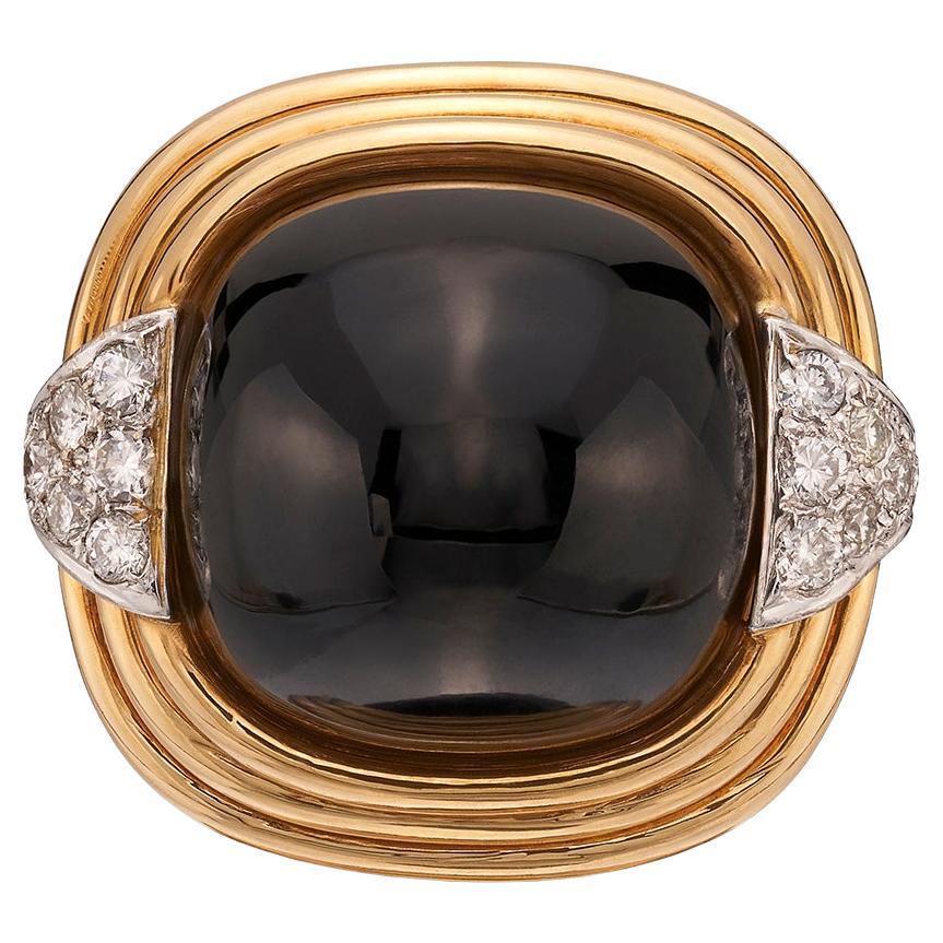 Un audace anello cocktail a cupola in oro bianco e giallo bicolore 18 carati con una perla bianca del mare del sud di 12 mm incastonata in un'aureola di pavé di diamanti tondi e bril...