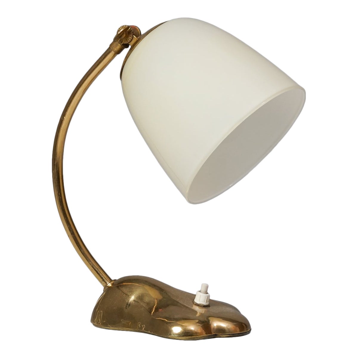 Lampada da tavolo regolabile in ottone e vetro opalino progettata e prodotta da Valinte Oy, Finlandia, anni Cinquanta.