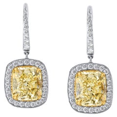 Questi orecchini sono semplicemente stupendi! Ogni orecchino ha uno zaffiro giallo oro di 8,5 x 7,5 mm. Entrambe le pietre hanno un totale di 4,65 carati. Sono circondate da pietr...