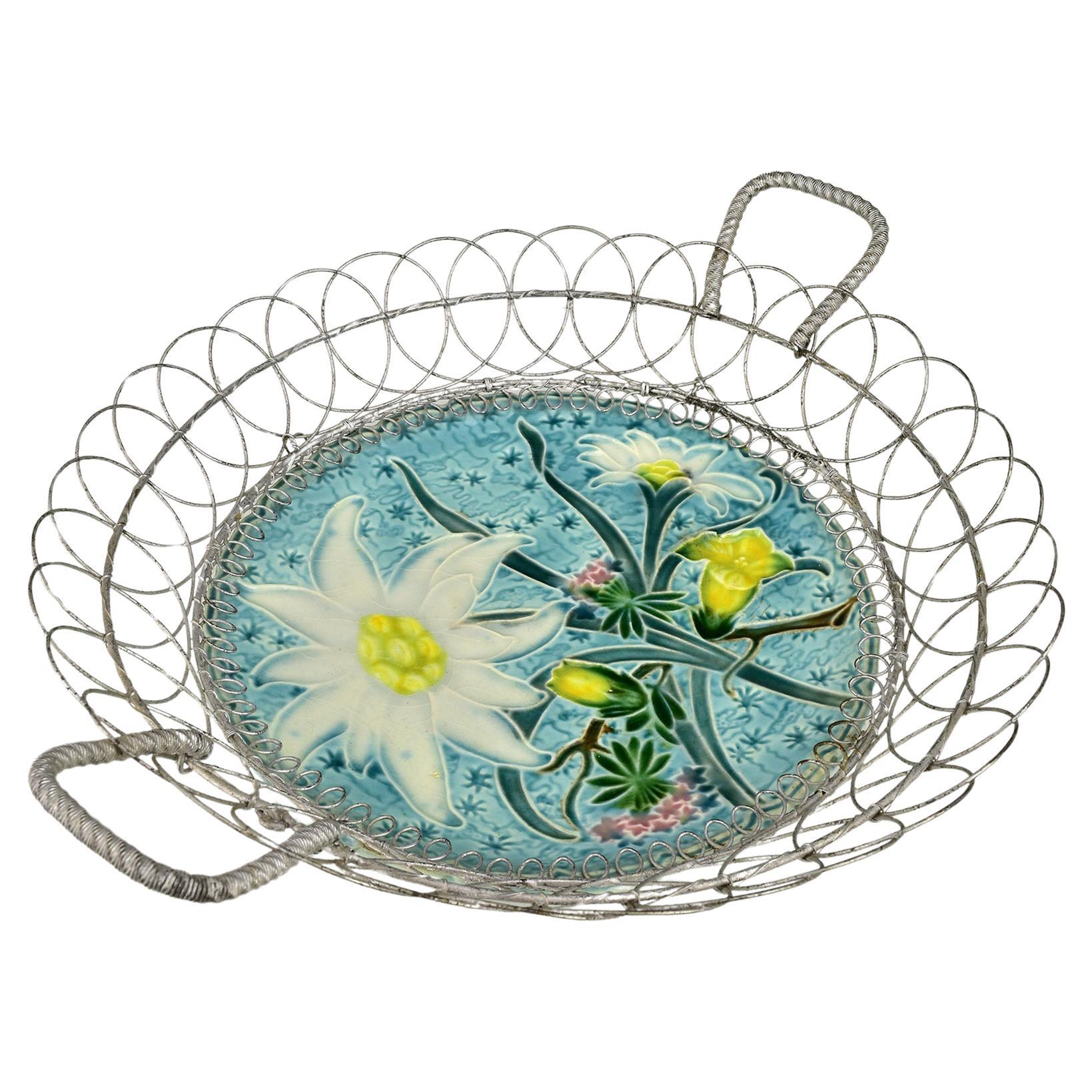 Un cestino del XIX secolo composto da un supporto in filo metallico ritorto e avvolto a mano con al centro un piatto in maiolica smaltata.