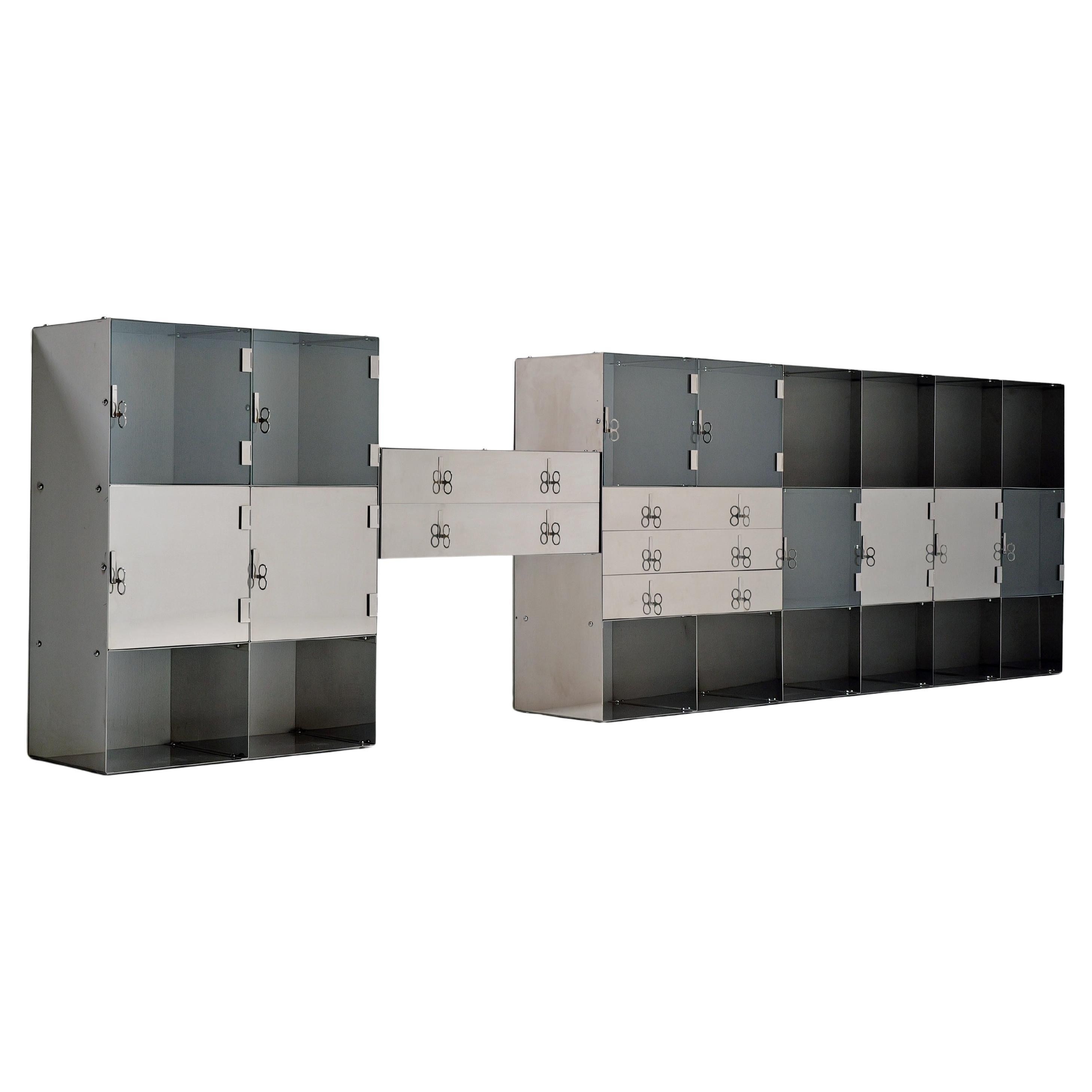 Vittorio Introini per Proposte, sistema di archiviazione a parete, modello 'P700', acciaio cromato, acciaio inossidabile, vetro fumé, Italia, 1969 Imponente libreria a giorno, notev...