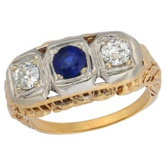 Anello a tre pietre con zaffiro e diamante in stile edoardiano a 14 carati