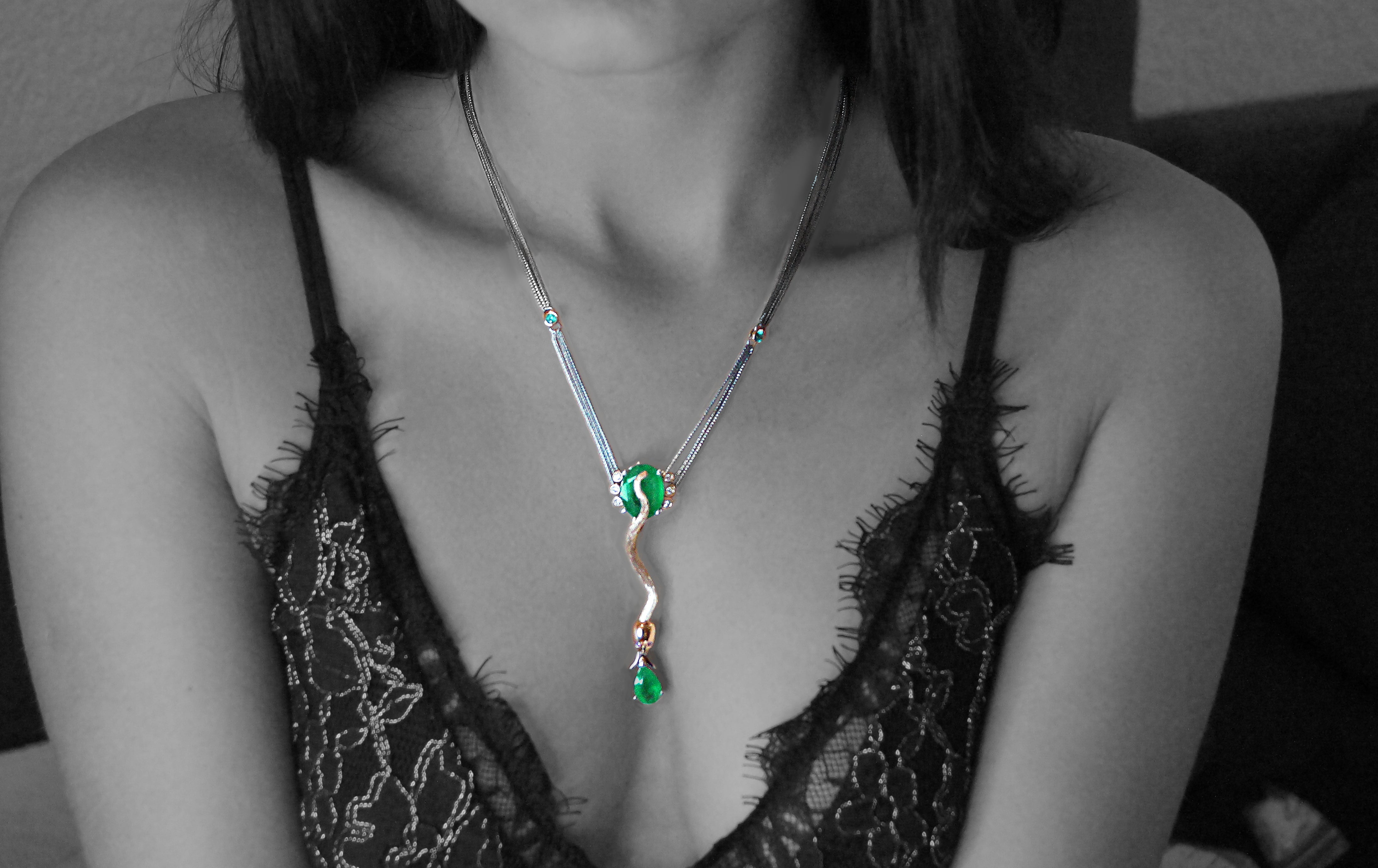 Seduction is the finest of arts. It is the victory of the moment, of passion. The snake, the symbol of perfect seduction, was our inspiration for this incomparable necklace of 18k whitegold and red gold, finished by an emerald of 7 carats, and framed by 6 flawless diamonds in finest white (D). From there, the snake rappels downward, its pink sapphire eyes fixed on a 2 carat emerald which it snaps at with its forked tongue