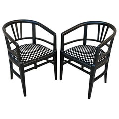 Coppia di poltrone Jugendstil in lacca nera e tappezzeria con motivo a scacchi