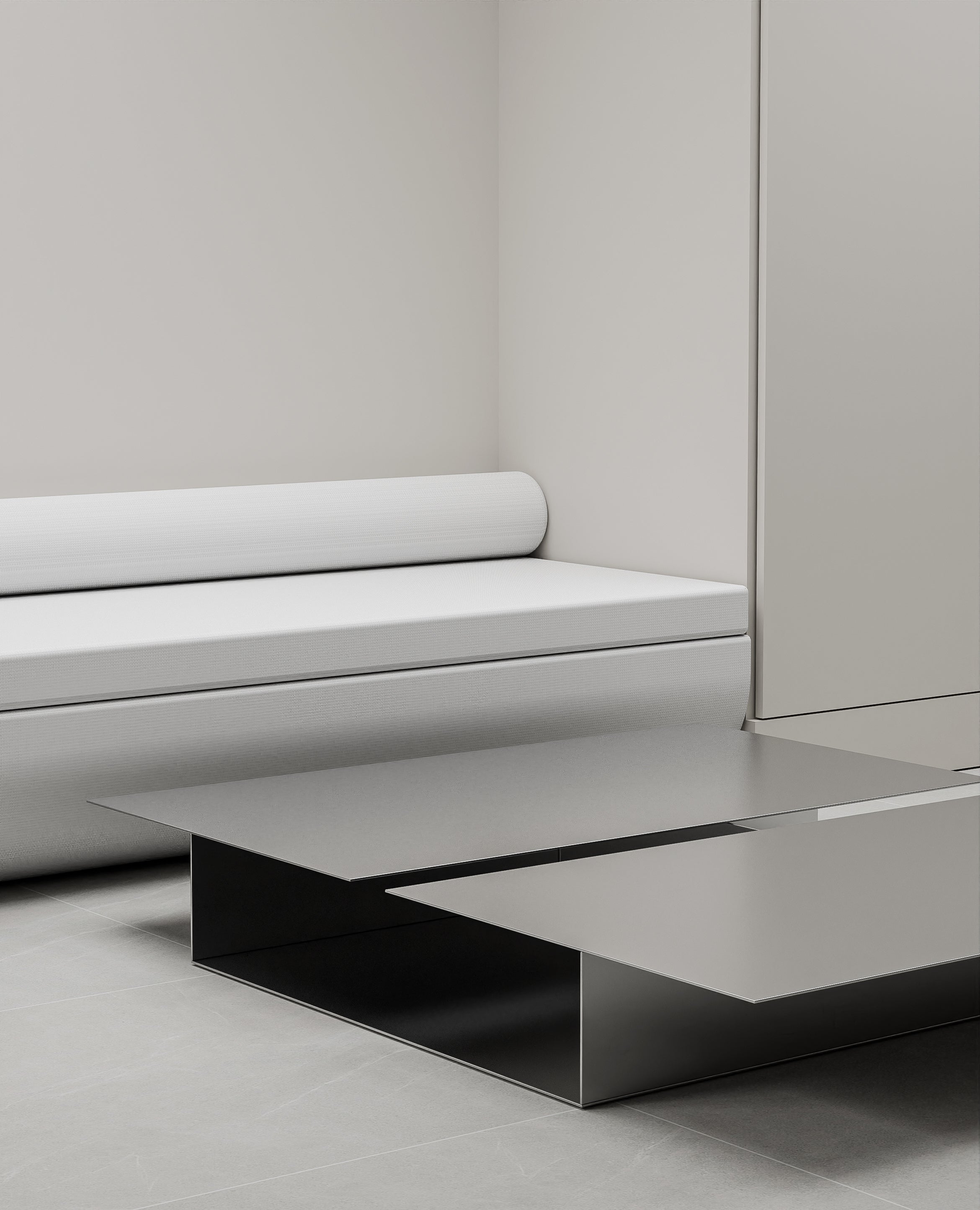 This low-profile coffee table is a masterclass in minimalist design. Defined by its sharp and architectural lines, it features a unique cantilevered top split by a central void. A st...