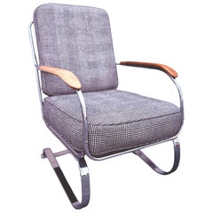 Sedia da salotto degli anni '40, art déco / machine age, di Kem Weber per Lloyd con struttura tubolare cromata a sbalzo, braccioli in legno di mogano e tessuto Original Prince of Wal...