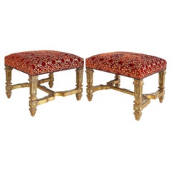 Pouf/panca in legno dorato intagliato, sedute ricamate, punte di chiodi, coppia, Luigi XIV