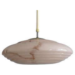 Grande lampada a sospensione a stelo Art Decor con paralume in vetro decorato a forma di UFO, risalente agli anni Trenta. Il paralume in vetro rosa marmorizzato è in ottime condizion...