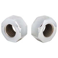 Bill Curry & Design Line Reggilibri a dado, nichel-cromo, ghisa, firmato. Fermalibri a forma di dado a otto facce, di dimensioni gigantesche e con filettature reali, rifiniti in crom...