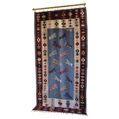 Arazzo svedese di metà secolo con disegno geometrico nei toni del blu, marrone, viola scuro e verde. In ottime condizioni, con l'etichetta del produttore attaccata sul retro.