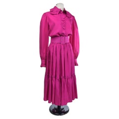 Gonna, blusa e cintura in taffetà acetato Fuschia della stilista parigina Popy Moreni risalente agli anni '90. Camicetta a maniche lunghe con colletto a sbuffo ev...