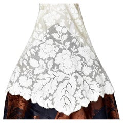 Mantilla o velo da cerimonia in pizzo di seta color crema chiamato Blonde, raccolto a Madrid. Forma a diamante decorata con grandi fiori al natural...