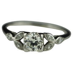 Realizzato negli anni '20, questo anello Art Déco è disegnato attorno a una pietra centrale di diamante di taglio europeo antico di circa 0,55 carati, di colore I-J e purezza VS, con...