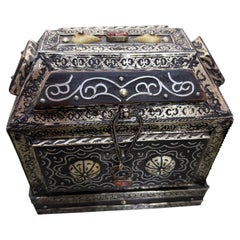 Scrigno giapponese d'epoca per gioielli a cineserie. Realizzato in Camphor Wood, presenta un paesaggio urbano intagliato con pagoda e ferramenta in ottone acidato. L'interno del cof...