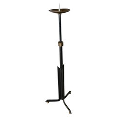 Coppia unica di candelieri alti in ferro provenienti dalla Francia, anni '50. La leccarda circolare poggia su uno stelo ondulato e una base a spirale. Bellissima aggiunta a qualsiasi...