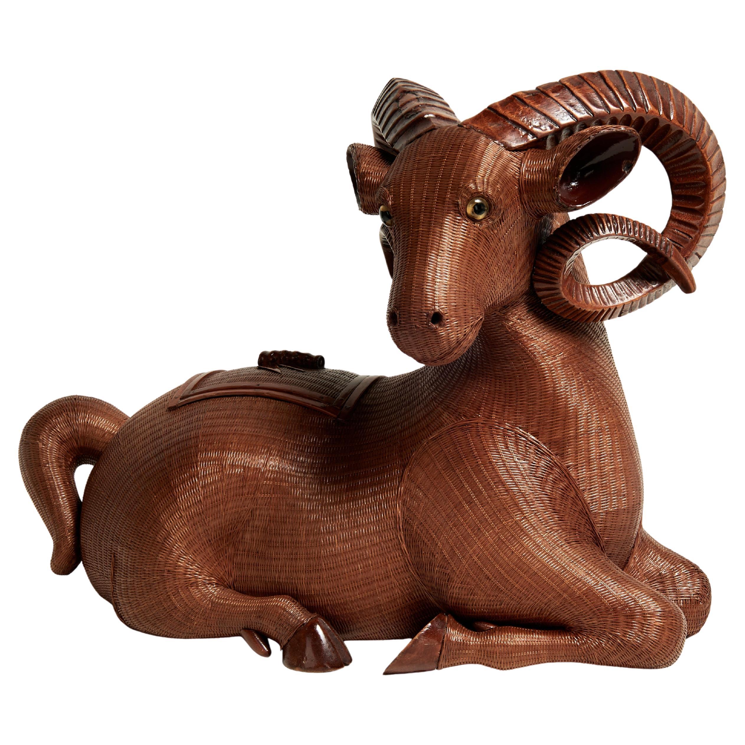 Notevole ariete cinese con coperchio rimovibile ambiziosamente realizzato a mano in vimini o giunco con zoccoli e corna in legno intagliato della Collection'S.