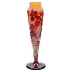 Gallé firmato, grande vaso a forma di banjo inciso all'acido, Francia, 1890