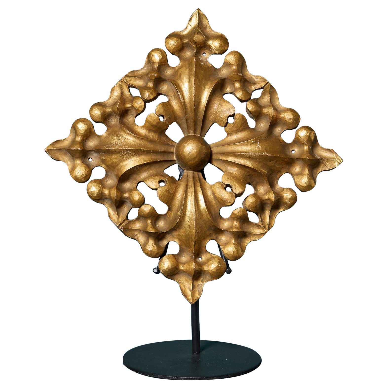 Una splendida scultura antica in stile ecclesiastico in legno di pino dorato, in precedenza un'opera sul tetto, esposta su un supporto in acciaio su misura; uno dei 4 pezzi simili ch...
