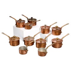 Rarissimo set di sette pentole a due manici di Antique French in rame con patina originale e buon peso e appannamento, un po' di ...