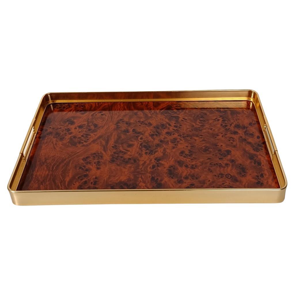 Vassoio italiano vintage in alluminio anodizzato oro e formica in finta radica, anni '60