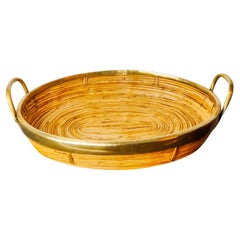 Vassoio da portata rotondo in bambù, rattan e ottone, Italia anni '70