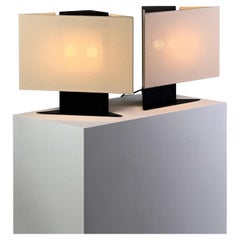 Questa coppia di lampade da tavolo italiane degli anni '50 presenta un design pulito e moderno costruito attorno a una composizione geometrica e compatta. Ogni lampada è strutturata ...