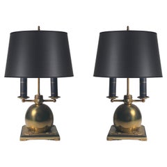 Coppia di lampade da tavolo italiane degli anni '50 in ottone con paralumi sferici in vetro opalino