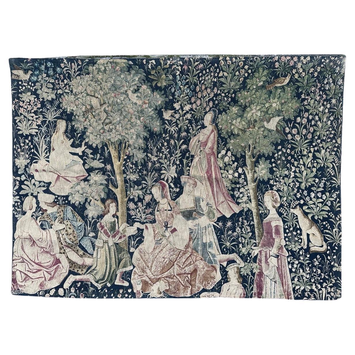 Scopri l'eleganza di questo arazzo francese di metà secolo serigrafato a mano con lo squisito design di un arazzo da museo medievale. Questo arazzo, una replica dell'opera original...