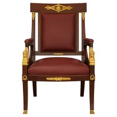 Sedia bergére Impero del XIX secolo ebanizzata con braccioli a cigno e ottone ormolato. Recentemente è stato rivestito in velluto di seta verde striato.