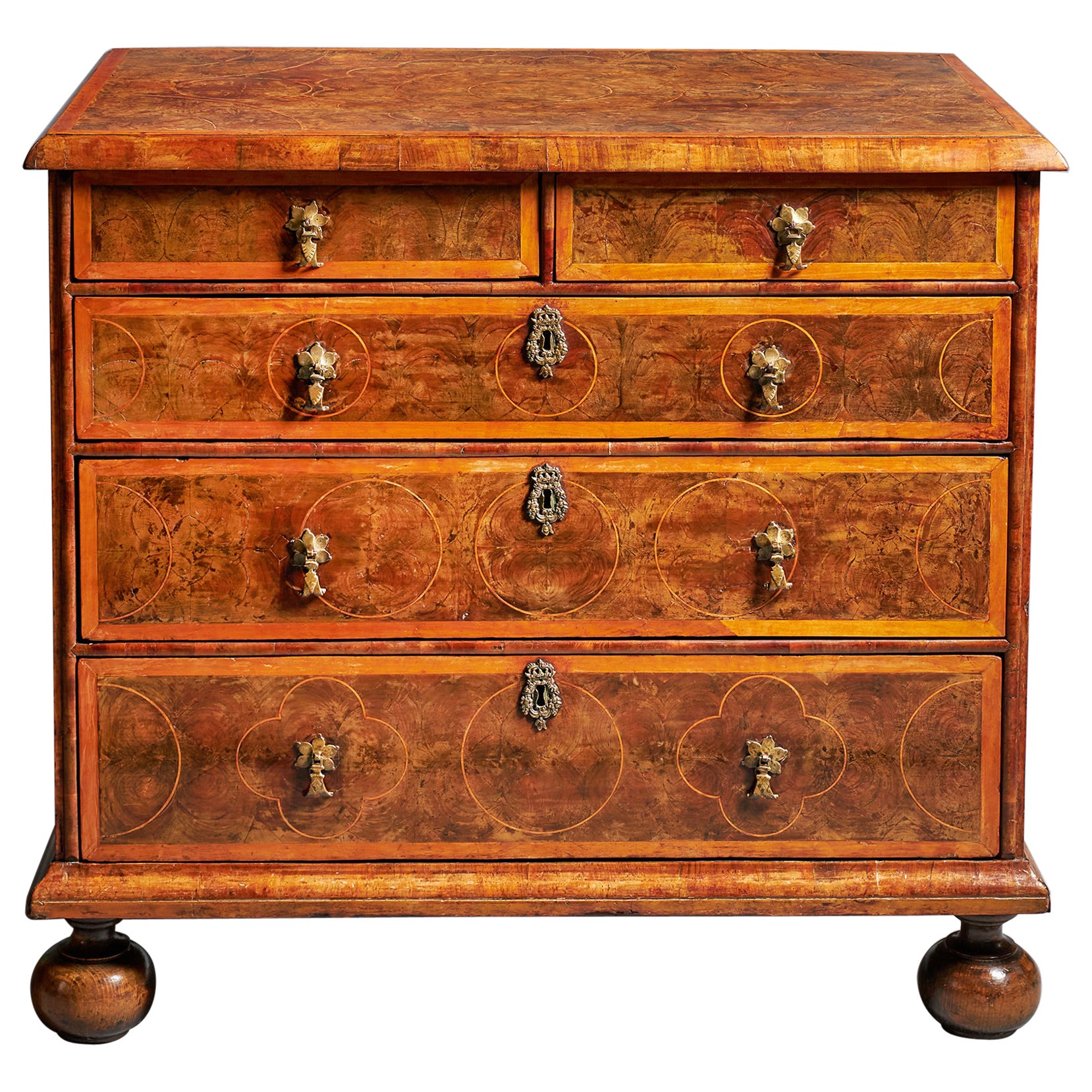 Cassettiera William & Mary Olive Oliver del XVII secolo Circa 1690, Inghilterra I due cassetti corti e i tre lunghi, rivestiti in Oak, sono impiallacciati in ostrica d'oliva finemen...