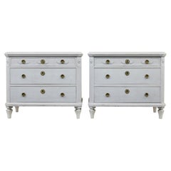 Una coppia splendidamente restaurata di commodes svedesi gustaviane dell'inizio e della metà del XX secolo, meticolosamente realizzate a mano in legno di pino dipinto. Queste raffina...