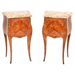 Tavolo da notte in stile Luigi XV francese vintage in mogano con piano in marmo rosa - una coppia