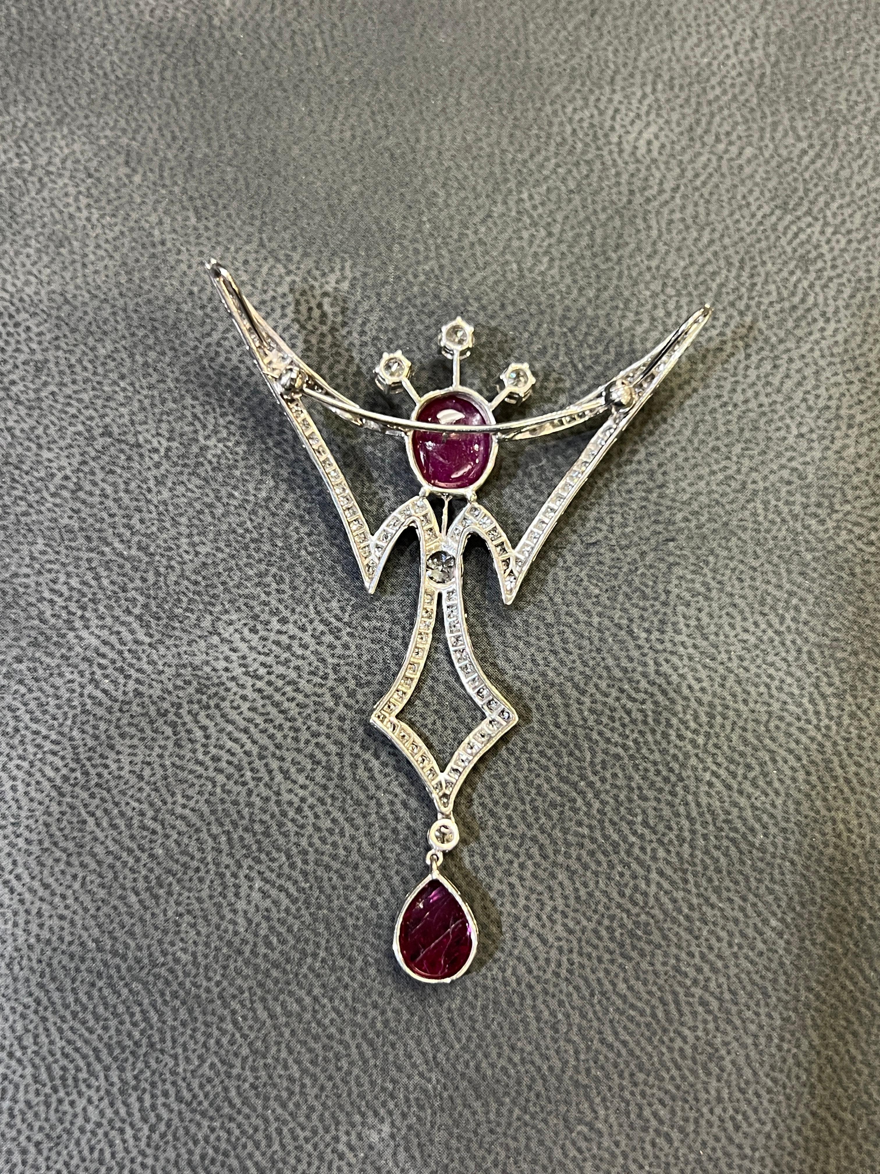 Una collana con un ciondolo con due rubini cabochon e diamanti taglio rotondo. Il ciondolo è rimovibile e può essere indossato come spilla.