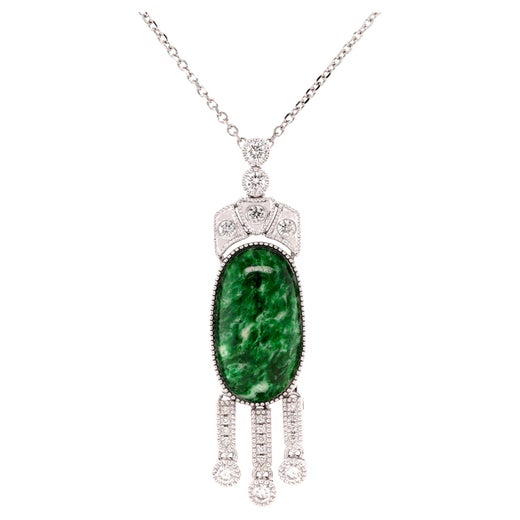Questa squisita collana con ciondolo in platino ha al centro un affascinante cabochon di 7,12ct maw sit, che irradia una profonda e vibrante tonalità verde. La giada è elegantemente ...