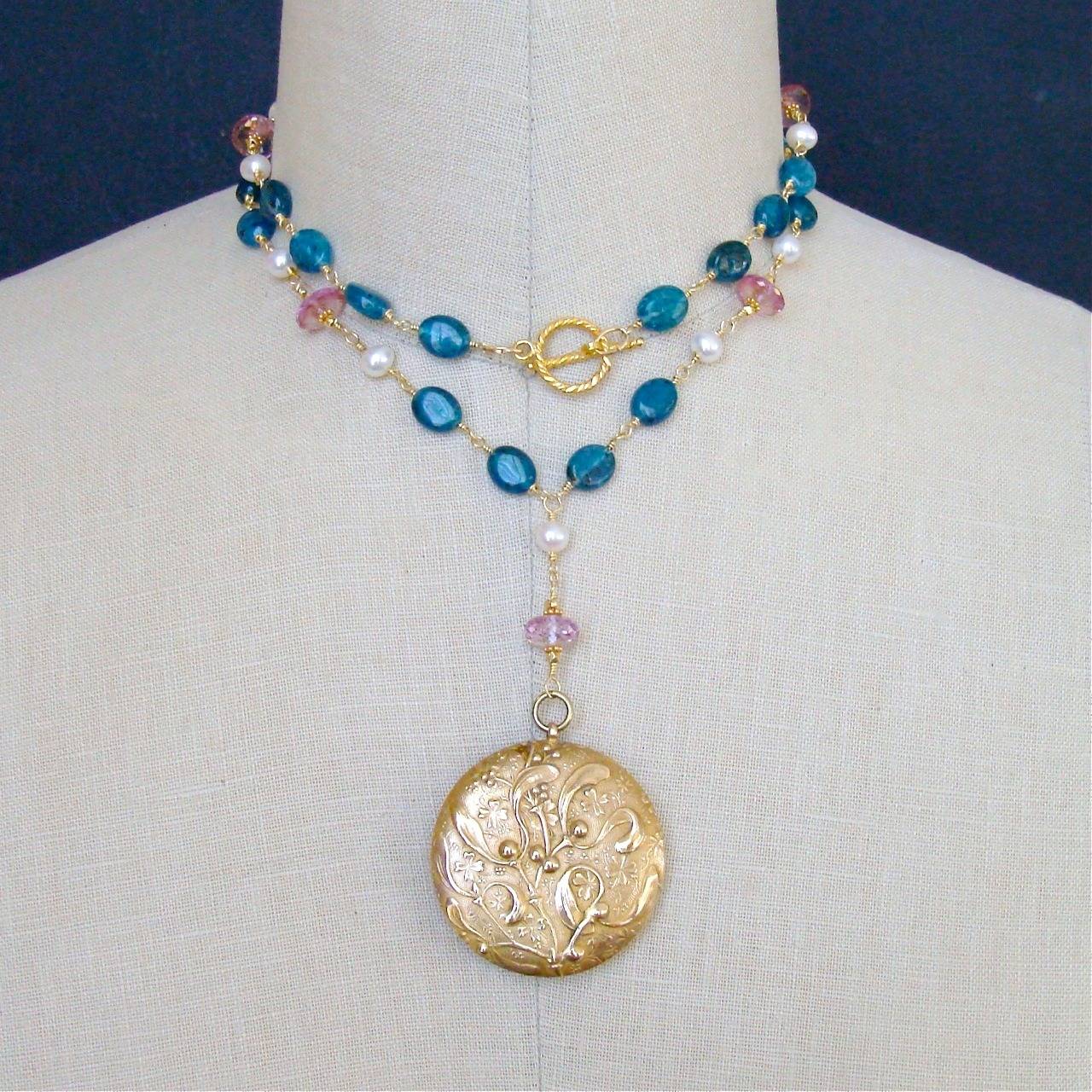 Articoli simili a Collana con medaglione in apatite, perle di topazio rosa e smalto Art Nouveau