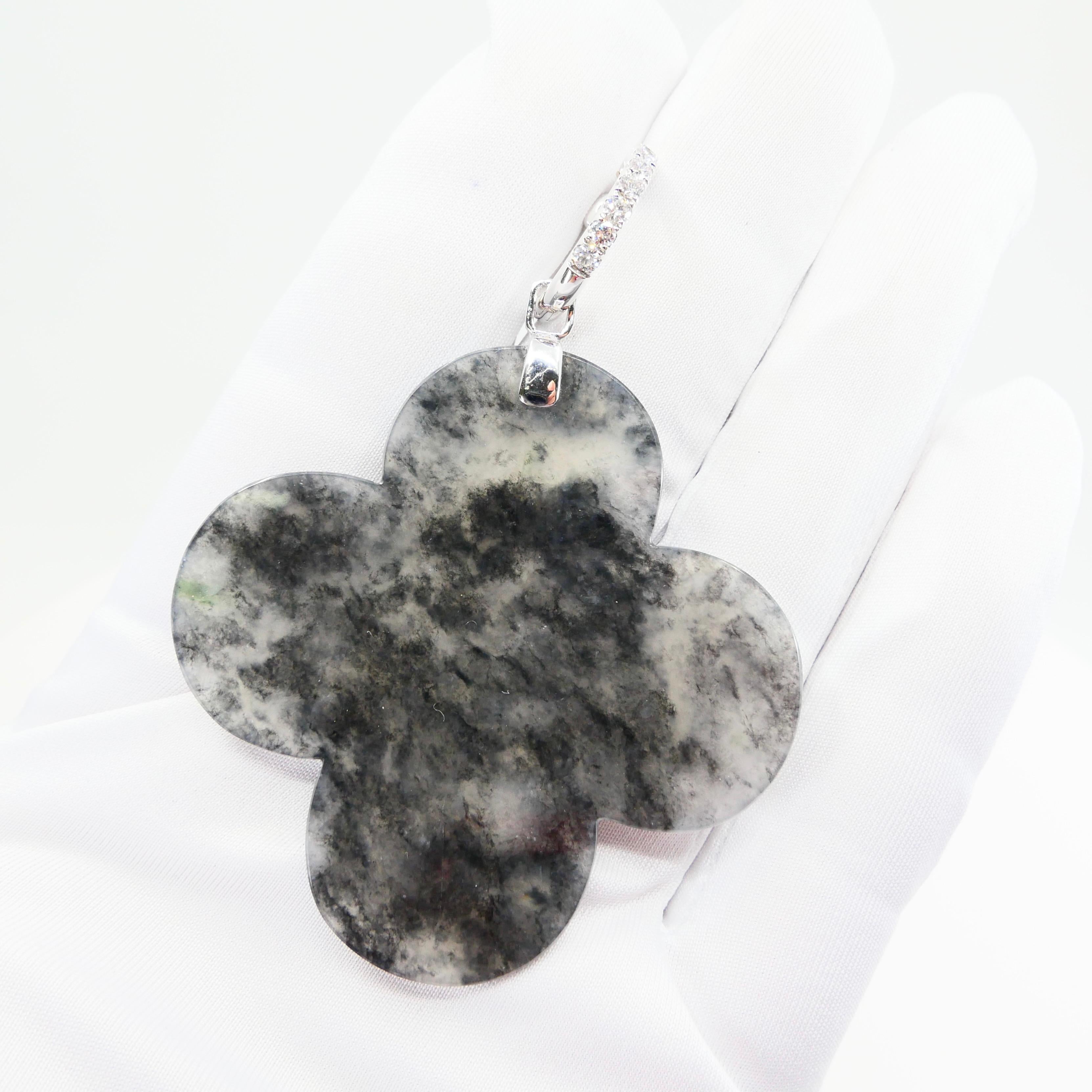 Guarda il video in HD! I perfetti orecchini di giada nera ghiacciata di dimensioni extra large! Puoi indossare questi orecchini in due modi, con o senza i grandi pezzi di giada. Ecco un paio di orecchini di giada nera naturale e diamanti. È difficile trovare giada nera di questa qualità. Queste giade hanno un bellissimo equilibrio tra incolore e nero. Gli orecchini sono incastonati in oro bianco 18 carati e diamanti bianchi. Ci sono 16 diamanti bianchi per un totale di 0.69cts. La giada ghiacciata naturale certificata, non trattata e non migliorata, è piena di vita. Le giade di questi orecchini presentano un'elevata trasparenza. Gli orecchini sono lunghi circa 7 cm e larghi 5,5 cm. Questi orecchini di giada sono bellissimi oltre ogni dire. Le giade sono così uniche! Le foto non fanno questi orecchini giustizia. Sarebbe un ottimo regalo per una persona speciale. Per maggiori dettagli, consulta le numerose foto ad alta definizione. Abbiamo anche fornito un video in HD. Dai un'occhiata.