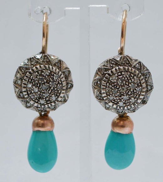 Orecchini pendenti a forma di fiore in oro giallo 18 carati con tourchese in pasta.
