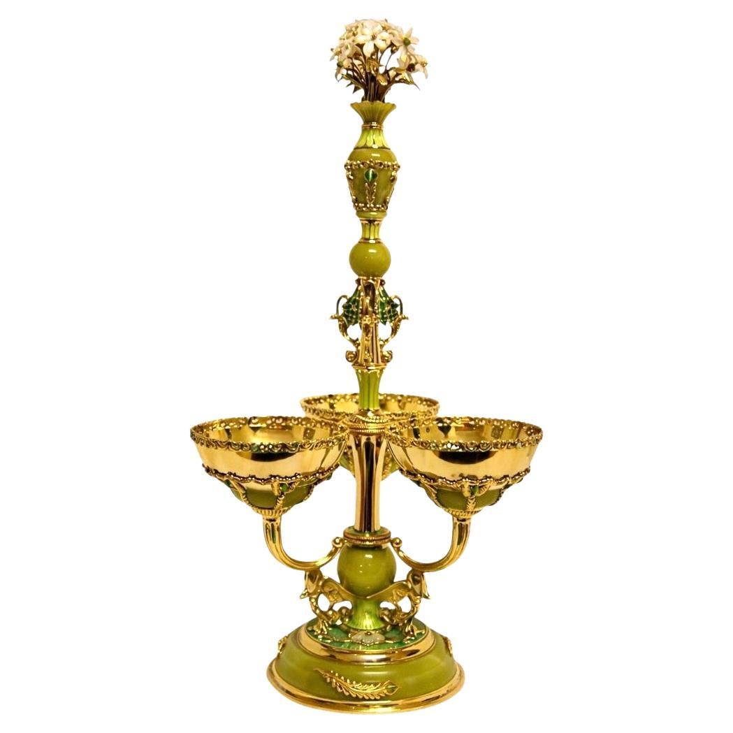 Centrotavola in argento dorato con giada al limone, smeraldi e il Volo del Cigno