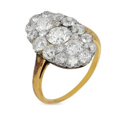 Un elegante anello a grappolo con diamanti di epoca edoardiana, realizzato in oro giallo 18 carati con montatura in platino, che mostra la raffinata maestria artigianale e le delicat...