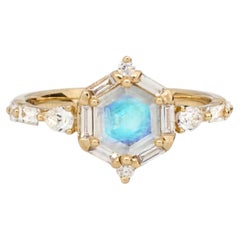 Anello antico con pietra di luna Oro giallo 18ct Circa 1880 Questo squisito anello vittoriano a grappolo ha come cuore una splendida pietra di luna cabochon che irradia un accatti...