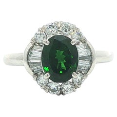 Questo elegante anello di fidanzamento ha al centro un granato ovale di tsavorite da 1,15 carati che mostra un verde intenso e saturo, una tonalità eccezionale apprezzata dai collezi...