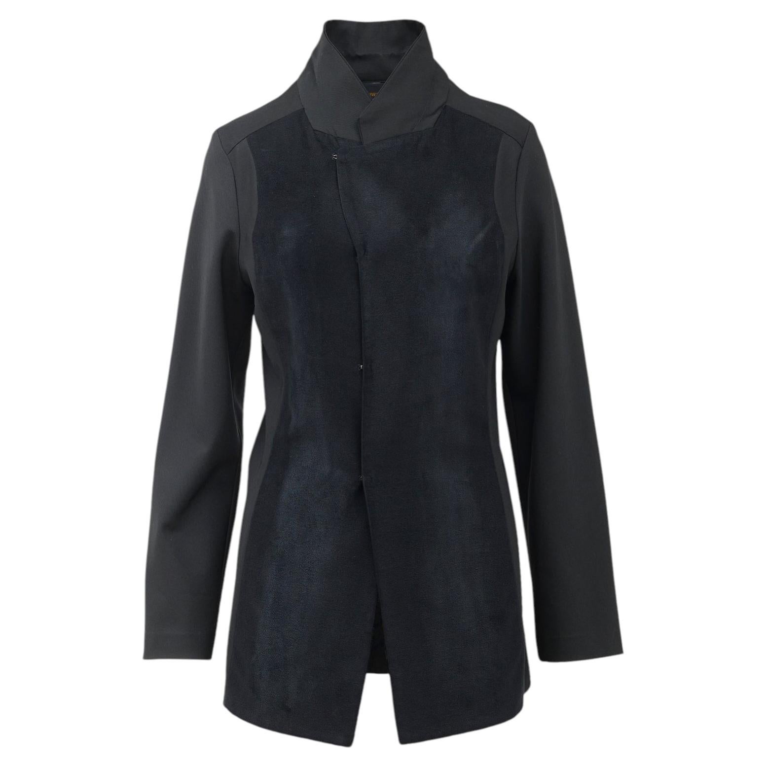 Blazer in lana nera Comme des Garçons Autunno/Inverno 1993 usato, con colletto dentellato, pannelli in pile di seta e chiusura frontale con gancio e occhiello. Parzialmente foderato....