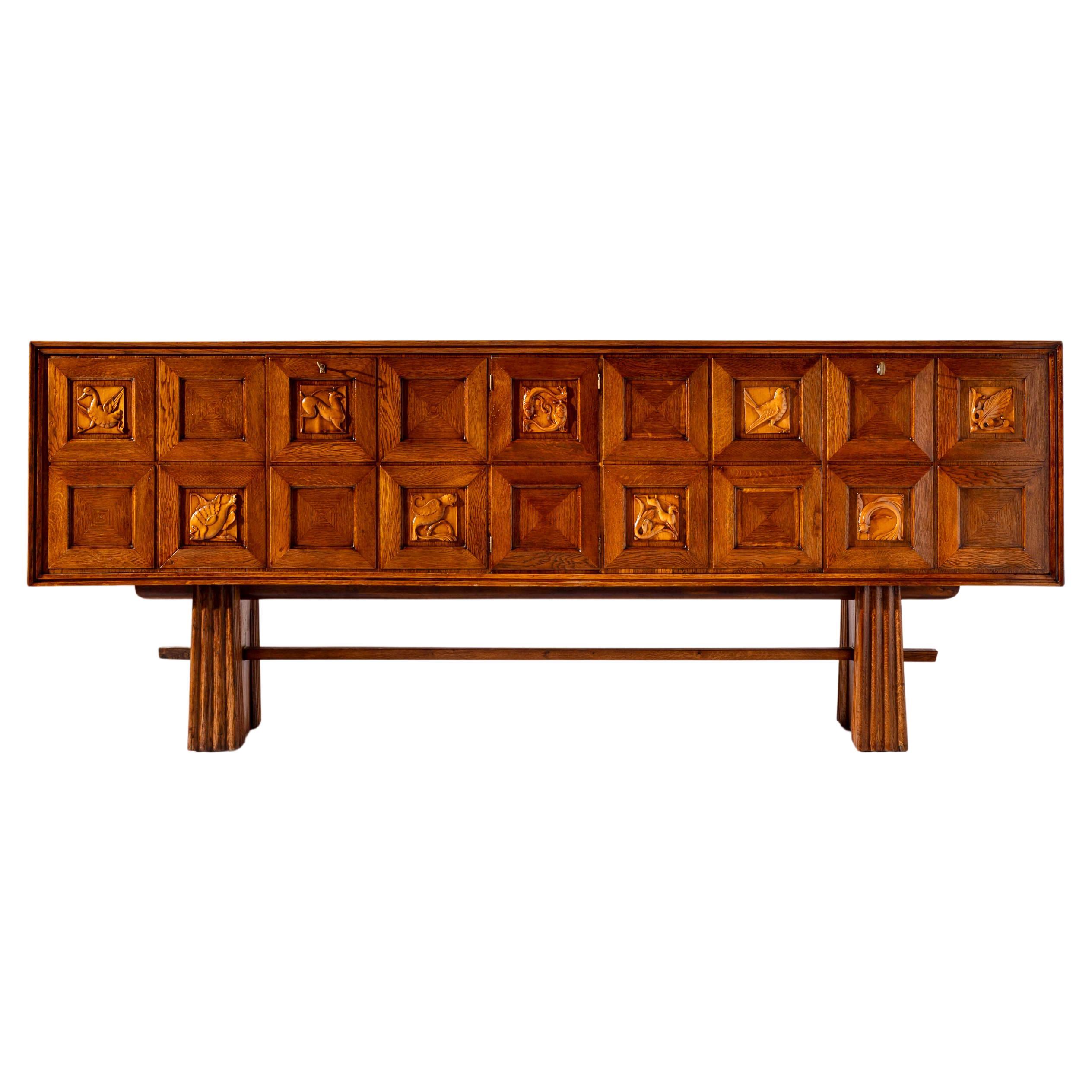 Pier Luigi Colli Credenza in legno di Oak con intarsi in noce intagliato, Italia, anni '40