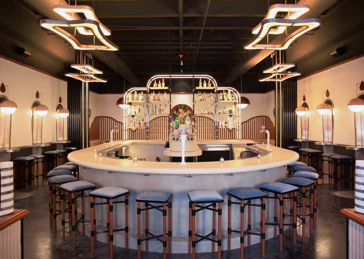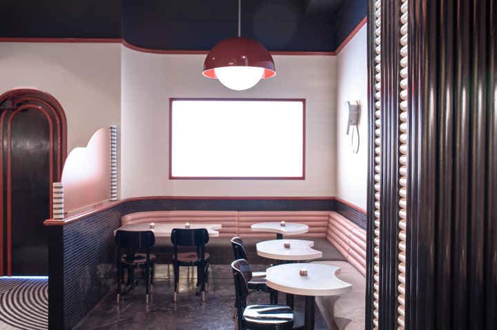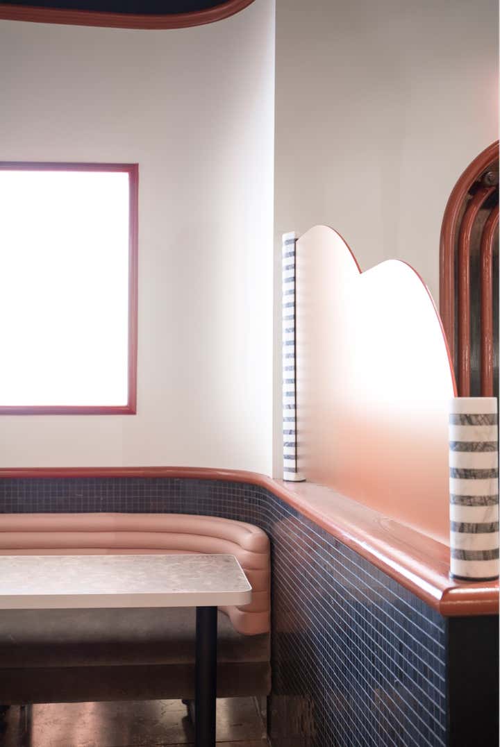 AN INVENTIVE, DYNAMIC, EPICUREAN BLEND OF A WORLDLY AND WORLD-CLASS COCKTAIL BAR, PARISIAN CAFÉ THROUGH THE LENS OF THE NEW WAVE AND BEST-KEPT SECRET NEIGHBORHOOD BOITE. 1900S VIENNA BY WAY OF 1960S PARIS BY WAY OF 2020S NEW YORK. AS IF 1960S EUROPEAN FILM DEVOTEES HAD SOUGHT TO RECREATE THE FEEL AND ATMOSPHERE OF THE NEW WAVE IN A MODERN CONTEXT, USING THE LIGHTING, MUSIC, CLOTHING AND, MOST IMPORTANTLY, COCKTAILS TO RECREATE THE FEELING, EVERY NIGHT, OF SEEING THOSE FILMS FOR THE FIRST TIME. THE FEELING OF EXCITEMENT AND ENJOYMENT THAT ARISES FROM HAVING ONE FOOT PLANTED IN THE TRADITIONS OF THE PAST WHILE TAKING A GIANT STEP INTO THE UNKNOWN OF THE FUTURE. A BAR THAT SEEKS TO IMAGINE WHAT THAT NEXT WAVE MIGHT BE AND SO CREATES AN ATMOSPHERE UNLIKE ANY OTHER. HOME STUDIOS CUSTOM ITEMS INCLUDE: RESIN AND CORK TABLE TOPS, GLASS AND MARBLE PARTITIONS, DOOR HANDLES AND PUSH PLATES, PEACH LEATHER AND TAUPE VELVET UPHOLSTERED BANQUETTES, LIGHTING THROUGHOUT.